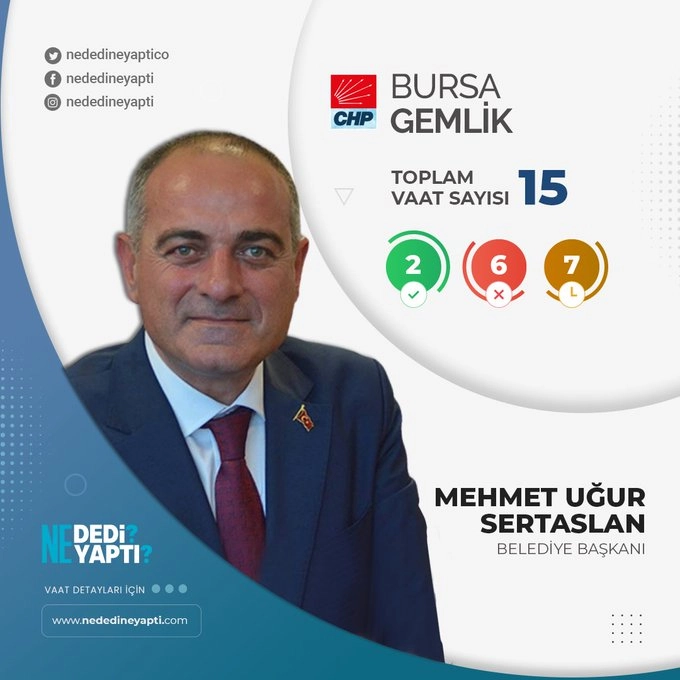 CHP’li Gemlik Belediye Başkanı Mehmet Uğur Sertaslan’ın 2019 yılındaki vaatlerini inceledik. Toplam 15 vaatte bulunan Mehmet Uğur Sertaslan, 2 projesini gerçekleştirirken 6 projesini hayata geçiremedi. Devam eden 7 projesi bulunuyor.