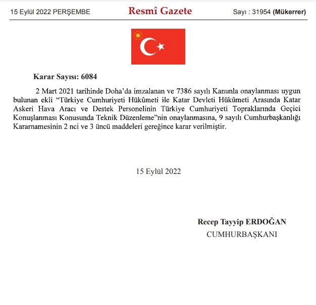 Resmi Gazete'de yayımlanan karara göre, Katar askeri hava araçları ve destek personelinin Türkiye'ye konuşlanmasına ilişkin anlaşma imzalandığı ortaya çıktı.