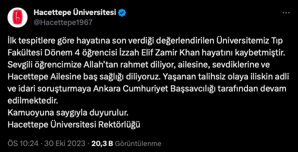 Olayla ilgili soruşturma başlatılırken üniversitenin sosyal medya hesabından yapılan paylaşımda, "İlk tespitlere göre hayatına son verdiği değerlendirilen Üniversitemiz Tıp Fakültesi Dönem 4 öğrencisi İzzah Elif Zamir Khan hayatını kaybetmiştir. Sevgili öğrencimize Allah’tan rahmet diliyor, ailesine, sevdiklerine ve Hacettepe Ailesine baş sağlığı diliyoruz. Yaşanan talihsiz olaya iliskin adli ve idari soruşturmaya Ankara Cumhuriyet Başsavcılığı tarafından devam edilmektedir. Kamuoyuna saygıyla duyurulur. Hacettepe Üniversitesi Rektörlüğü " ifadeleri yer aldı.