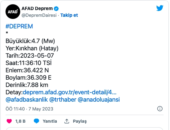 Afet ve Acil Durum Yönetimi Başkanlığı (AFAD) verilerine göre; saat 11.36'da merkez üssü Hatay'ın Kırıkhan ilçesi olan 4.7 büyüklüğünde bir deprem meydana geldi. Sarsıntının derinliği 7.88 kilometre olarak ölçüldü.