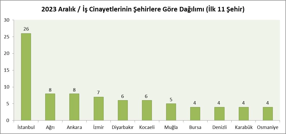 Rapora göre, aralık ayında 50 şehirde ve yurtdışında dört ülkede (kısa vadeli çalışmak için gidilen veya Türkiye menşeili şirketlerde çalışan) iş cinayeti tespit edildi.