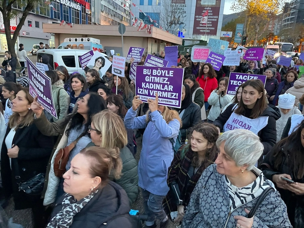 Bursa Kadın Platformu’nun çağrısıyla kadınlar Bursa’da Fomara Meydanı’nda bir araya geldi. “Geceleri de sokakları da meydanları da terk etmiyoruz”, “Kadınlar yürüyor mücadele büyüyor” sloganları eşliğinde Kent Meydanı’na yürüyen kadınlar burada hem Türkçe hem de Kürtçe basın açıklaması düzenledi.
