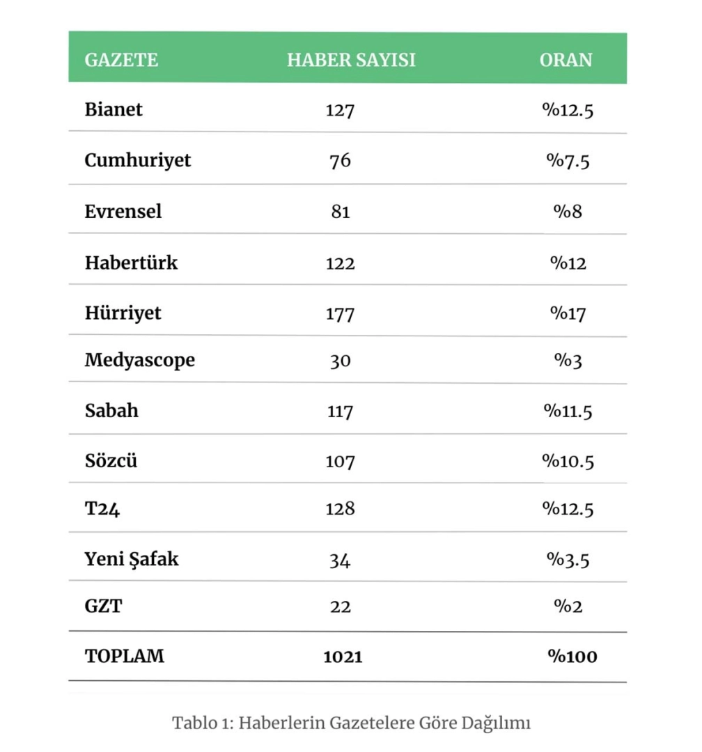Yayınlanan rapora göre iklim krizine dair en çok haber Bianet tarafından yapıldı. Konuya dair 127 haber yapan Bianet'i, 76 haberle Cumhuriyet gazetesi takip etti. İncelenen 1021 haber arasında iklim krizine dair en az haber yapan çevrimiçi haber siteleri Yeni Şafak ve GZT oldu.