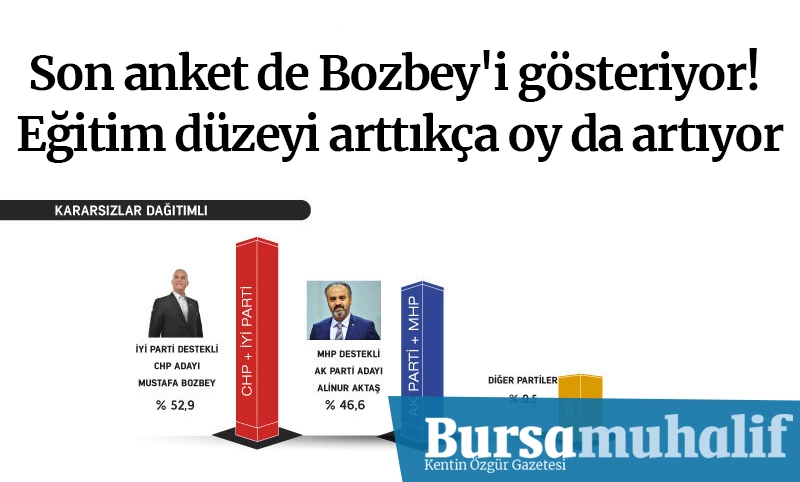 Gezici Araştırma şirketinin yaptığı anket incelendiğinde ilginç veriler ortaya çıkıyor. "31 Mart seçimlerinde Mustafa Bozbey'in Belediye Başkanı olmasını ister misiniz?" sorusuna verilen yanıtların demografisine göre ortaokul ve altı mezunu kişiler yüzde 42, lise mezunu yüzde 52, üniversite ve üstü mezunları ise yüzde 57 olumlu yanıt verdi. Aynı soru Alinur Aktaş için sorulduğunda ise ortaokul ve altı mezunu kişiler yüzde 47, lise mezunu yüzde 31, üniversite ve üstü mezunları ise yüzde 34 olumlu yanıt verdi.