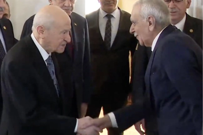Heyet ardından MHP Genel Başkanı Devlet Bahçeli ile bir görüşme gerçekleştiriyor. Bahçeli, DEM heyetini kapıda karşıladı.