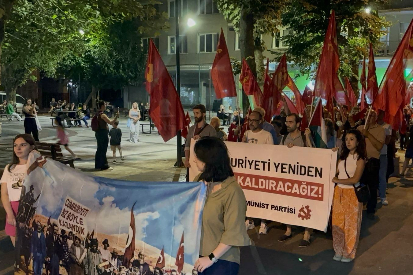 Bu akşam burada; dedeleri, nineleri 103 yıl evvel işgalci namlularına, süngülerine karşı direnip düşmanı vatanımızdan kovmuş emekçilerin, kahramanların torunları var. İşçiler, emekliler, öğretmenler , öğrenciler ve direnenler var. Bu ülkenin aydınlık yarınlarının temsilcileri var. 103 yıl önce Mustafa Kemal önderliğinde emperyalistleri bu topraklardan söküp atanlara saygımızı sunup cumhuriyeti yeniden ayağa kaldırma irademizle buradayız."
