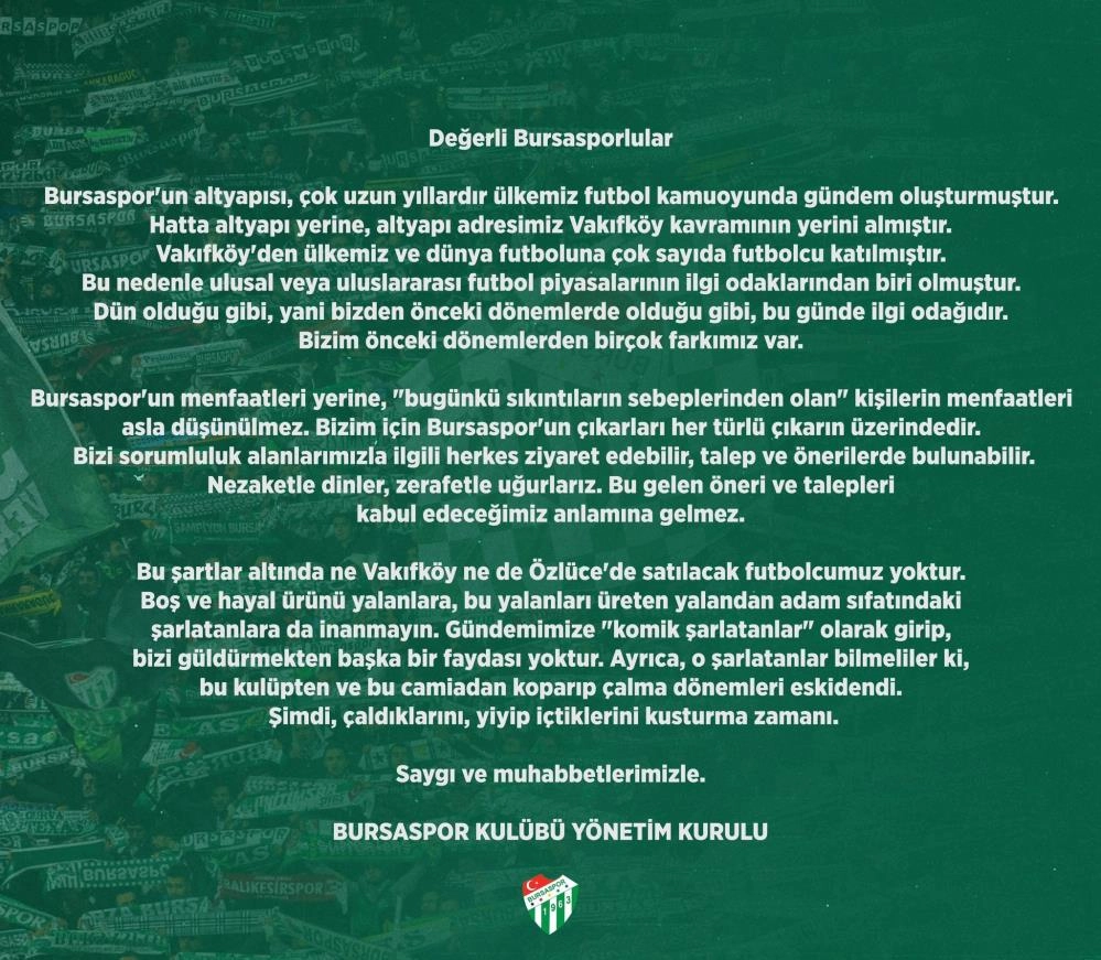 “Bursaspor'un altyapısı, çok uzun yıllardır ülkemiz futbol kamuoyunda gündem oluşturmuştur. Hatta altyapı yerine, altyapı adresimiz Vakıfköy kavramının yerini almıştır. Vakıfköy'den ülkemiz ve dünya futboluna çok sayıda futbolcu katılmıştır. Bu nedenle ulusal veya uluslararası futbol piyasalarının ilgi odaklarından biri olmuştur. Dün olduğu gibi, yani bizden önceki dönemlerde olduğu gibi, bu günde ilgi odağıdır. Bizim önceki dönemlerden birçok farkımız var. Değerli Bursasporlular, Bursaspor'un menfaatleri yerine, ‘bugünkü sıkıntıların sebeplerinden olan’ kişilerin menfaatleri asla düşünülmez. Bizim için Bursaspor'un çıkarları her türlü çıkarın üzerindedir. Bizi sorumluluk alanlarımızla ilgili herkes ziyaret edebilir, talep ve önerilerde bulunabilir. Nezaketle dinler, zarafetle uğurlarız. Bu gelen öneri ve talepleri kabul edeceğimiz anlamına gelmez. Bu şartlar altında ne Vakıfköy ne de Özlüce'de satılacak futbolcumuz yoktur. Boş ve hayal ürünü yalanlara, bu yalanları üreten yalandan adam sıfatındaki şarlatanlara da inanmayın. Gündemimize 'komik şarlatanlar’ olarak girip, bizi güldürmekten başka bir faydası yoktur. Ayrıca, o şarlatanlar bilmeliler ki, bu kulüpten ve bu camiadan koparıp çalma dönemleri eskidendi. Şimdi, çaldıklarını, yiyip içtiklerini kusturma zamanı. Saygı ve muhabbetlerimizle. Bursaspor Kulübü Yönetim Kurulu.”