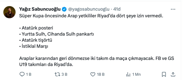 Gazeteci Yağız Sabuncuoğlu da Suudi yetkililerin Riyad’da "Atatürk posteri", "Yurtta Sulh, Cihanda Sulh pankartı", "Atatürk tişörtü" ve "İstiklal Marşı"na izin vermediğini belirterek karadan dönülmez ise iki takımın maça çıkmayacağı yönünde bir paylaşım yaptı.