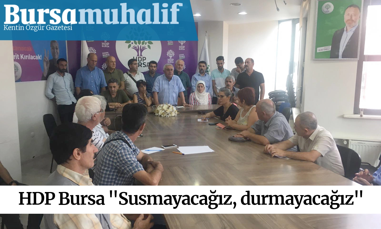 Halkların Demokratik Partisi Bursa İl Örgütü, tek adam diktatörlüğünün son darbesi olan Diyarbakır, Van ve Mardin Belediye Eşbaşkanlarının görevden alınmasını protesto etti. Bugün HDP Bursa İl Binası'nda yapılan açıklamada konuşan HDP İl Eşbaşkanı Resul Baykara, "Diyarbakır’da yüzde 63, Mardin’de yüzde 56 ve Van’da yüzde 53 oyla seçilmiş olan Belediye Eşbaşkanlarımız İçişleri Bakanlığı’nın yalanlara ve hukuksuz gerekçelere dayalı bir emri ile görevden alınmıştır. Belediye Meclis üyelerimize ve belediyelerimizde çalışanlara yönelik ağır bir gözaltı operasyonu halen sürmektedir." şeklinde konuştu.
