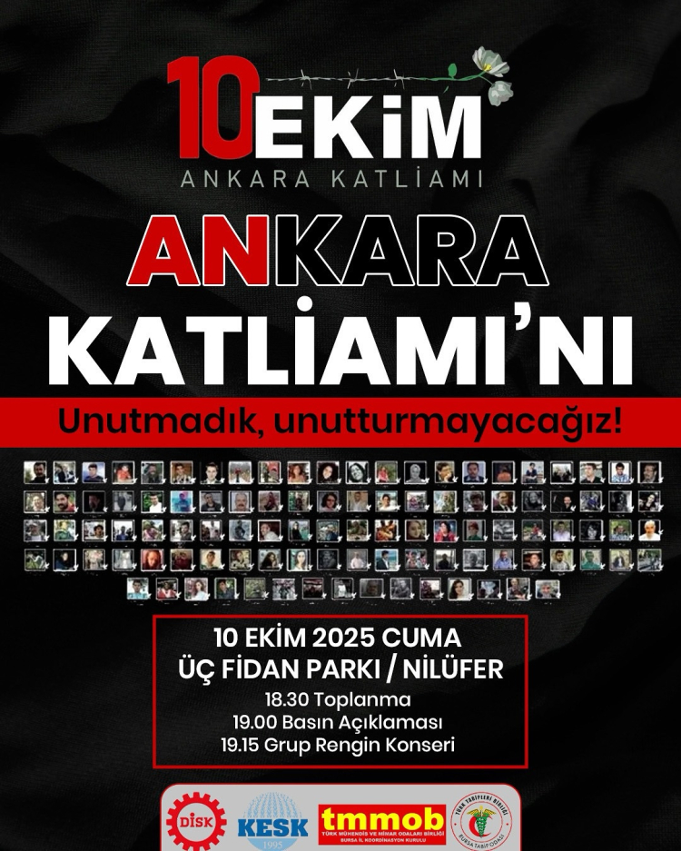 DİSK, KESK, TMMOB ve Bursa Tabip Odası’nın çağrısıyla 10 Ekim Katliamı’nın yıldönümünde hayatını kaybedenler Bursa’da anılacak. 10 Ekim Cuma günü saat 18.30’da Üç Fidan Parkı'nda toplanıp 19.00'da basın açıklaması gerçekleştirilecek.Saat 19.152'de ise Grup Rengin konser verecek.