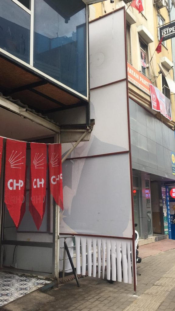 Önüne asılan afiş, Türk Bayrağı ve Atatürk posteri ile CHP Seçim Bürosu’nun önceki ve AKP’nin önünü kapattıktan sonraki fotoğraflarını paylaşan CHP Orhangazi İlçe Başkanı Vural Çetin şunları söyledi: