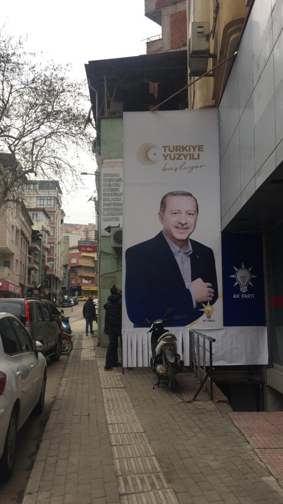Adalet ve Kalkınma Partisi Orhangazi İlçe Başkanlığı'nın bitişik binada açılan CHP seçim bürosunun önünü kapatmak için başvurduğu yöntem tepki çekti. Üzerinde AKP Genel Başkanı Recep Tayyip Erdoğan’ın fotoğrafının bulunduğu reklam panosu, CHP seçim bürosunun görünmesini engelleyebilmek için yaya geçidine kadar genişletildi.
