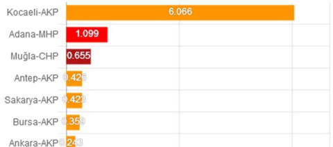 En borçlu belediye 6 milyar 66 milyon lira ile AKP’li Kocaeli Büyükşehir Belediyesi. MHP’li Adana Büyükşehir Belediyesi ise 1 milyar 99 milyon lira borç ile ikinci sırada. Borçlu belediyeler sıralamasında üçüncü sırada 655 milyon liralık borçla CHP’nin Muğla Büyükşehir Belediyesi’nin Su ve Kanalizasyon İdaresi yer aldı. Bursa Büyükşehir Belediyesi ise 359 milyon lira borç ile altıncı sırada yer aldı.