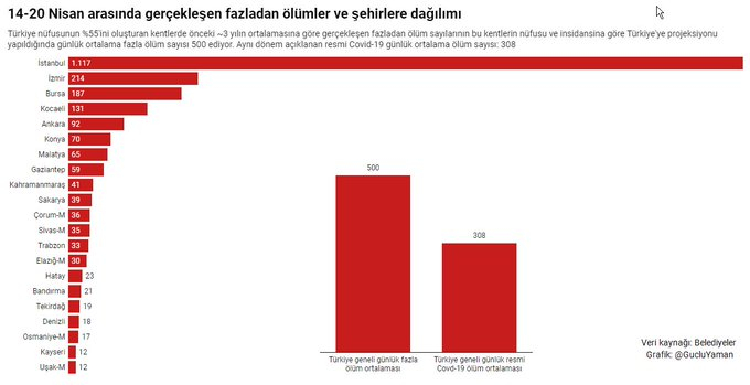 Koca’nın bu açıklamalarının ardından Twitter hesabından bir tablo paylaşan Türk Tabipleri Birliği, 14-20 Nisan haftasında; nüfusun %55’inin yaşadığı 21 ilde toplam ölümlerin, önceki 3 yıl ortalamasından %58, İstanbul’daki 1117 fazladan ölümün ise, önceki 5 yıl ortalamasından %80 fazla olduğunu aktardı. TTB’de açıklamasında “Bu tabloda “vaka sayısındaki düşüş”ten bahsetmek, açıkça toplumu aldatmaktır!” dedi.