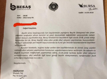 Yazıda, "Bugüne kadar verilen tüm bayiliklerimizde ekmek satışı yapılan noktada alkol satışının yapılmaması hususunun uygulanmasına karar verilmiştir. Bu sebeple bayinizin mağduriyet yaşamaması adına 31 Mart 2018 tarihine kadar alkol satışını sonlandırmanızı, aksi takdirde sözleşmenizin tarafımızdan fesih edileceğini bilgilerinize rica ederiz" ifadeleri kullanıldı.