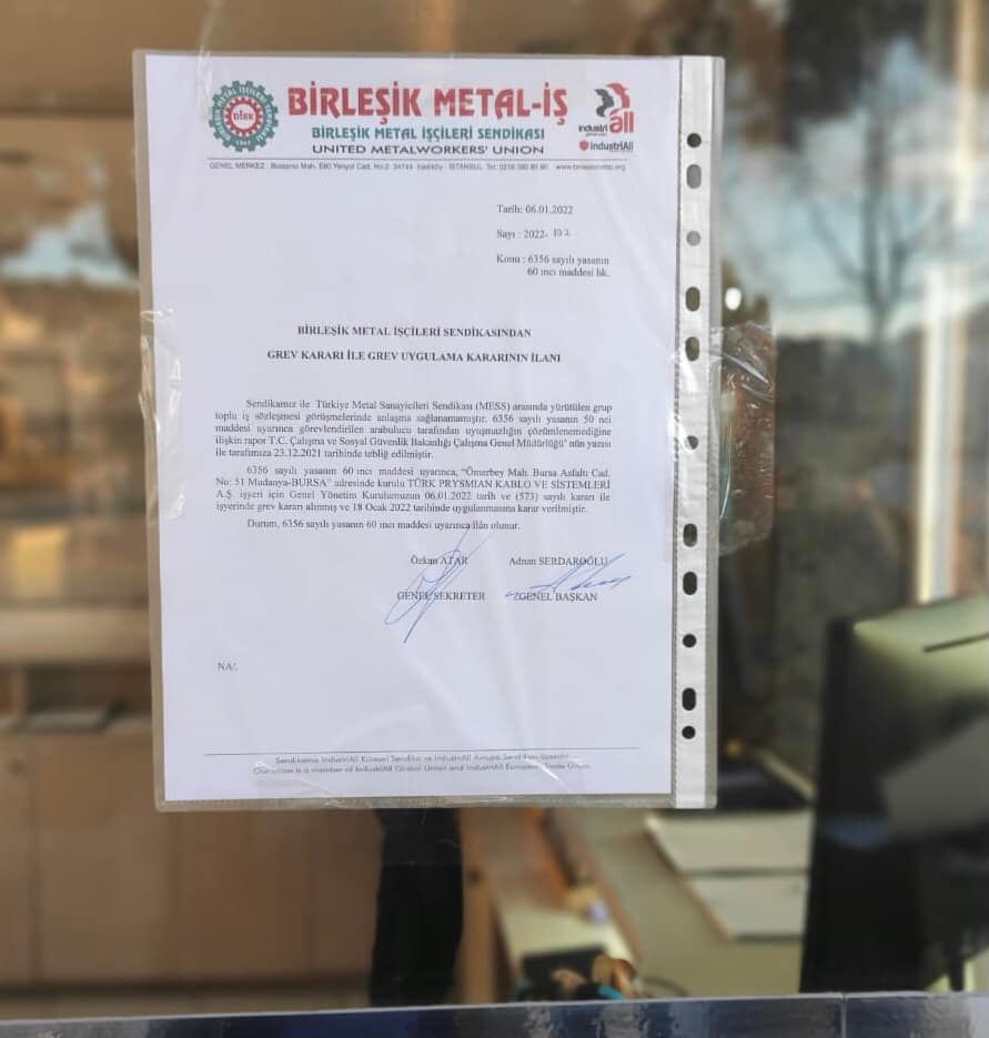 Birleşik Metal-İş'in MESS ile yaptığı görüşmelerin uyuşmazlıkla sonuçlanması üzerine Bursa'da kurulu bulunan Türk Prysmian Kablo ve Sistemleri A.Ş’ye grev kararını astı.
