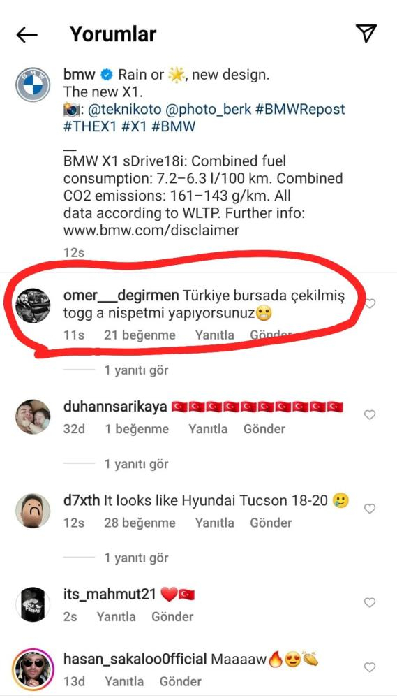 Dünyaca ünlü otomobil markası BMW, Türkiye’nin yerli otomobili TOGG’un Gemlik rengini anımsatan ve TOGG’a benzemesiyle dikkat çeken modelini Gemlik sahilinde fotoğraf çekerek sosyal medya hesabında yayınladı. Paylaşımı gören takipçiler ise, “Yoksa siz TOGG’a nispet mi yapıyorsunuz?” şeklinde yorumlar yaptı.