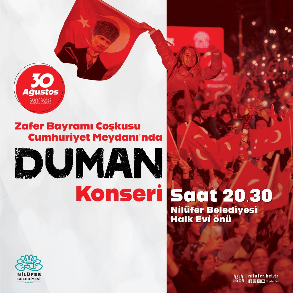 Ve Nilüfer Belediyesi… Nilüfer’de 30 Ağustos coşkusu Duman konseri ile yaşanacak. Saat 20.30 başlayacak konser Nilüfer Belediyesi Halk Evi önünde gerçekleşecek.