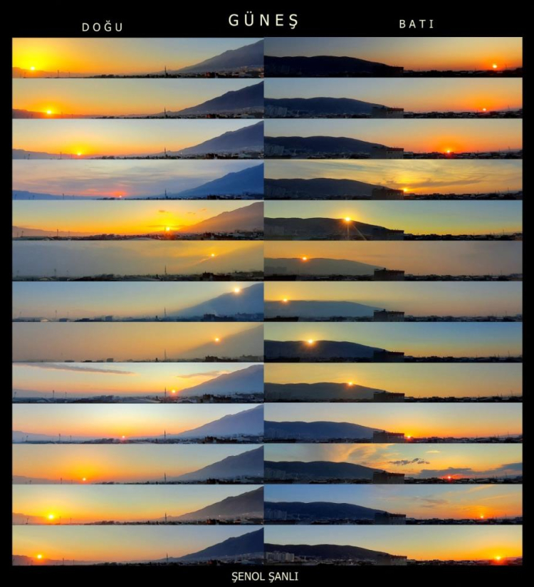 Bursa'da gökyüzü fotoğrafçılığıyla ilgilenen Şenol Şanlı, güneşin yıl içerisindeki ufuk hareketlerini gösteren dikkat çekici bir çalışmaya imza attı. Şanlı, Bursa'nın doğu ve batı ufuklarında 1 yıl boyunca, her ay aynı noktalardan çektiği güneş fotoğraflarını tek bir karede birleştirdi.
