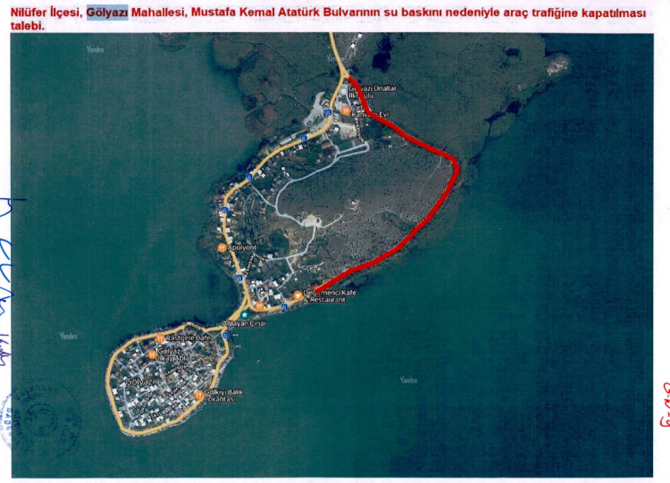 Bursa’nın Nilüfer ilçesine bağlı Gölyazı Mahallesi’nde Uluabat Gölü’nün su seviyesinin yükselmesi sonrası mahalleyi çevreleyen yol sular altında kaldı. UKOME kararıyla Mustafa Kemal Atatürk Bulvarı araç trafiğine kapatıldı. Yol, su seviyesi düşene kadar kapalı kalacak.