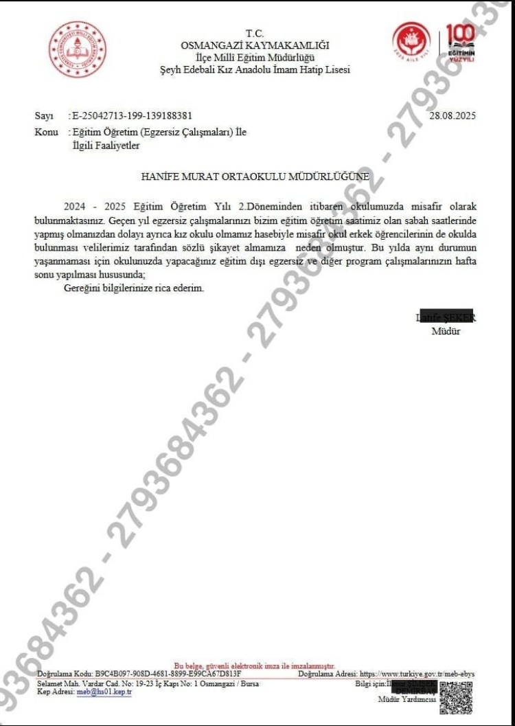 Bursa Osmangazi’deki Şeyh Edebali Kız Anadolu İmam Hatip Lisesi müdürü, misafir okul Hanife Murat Ortaokulu Müdürlüğü'ne yazı göndererek erkek öğrencilerin hafta içi okula girmemesi için yazı gönderdi.