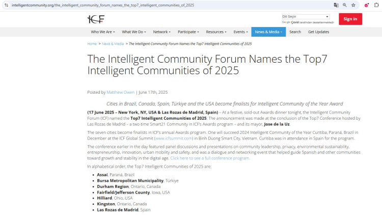 “Türkiye'den Bursa Büyükşehir Belediyesi, 2025 yılında Top7 Intelligent Communities’e girdi. Türkiye'nin kuzeybatısında yer alan Bursa; tarihin yankılarının, modernitenin ritimleriyle uyum içinde olduğu bir şehir olarak öne çıkıyor. Şehir genelinde ücretsiz Wi-Fi, gerçek zamanlı gözetim sistemleri, akıllı aydınlatma ve etkileşimli kent mobilyaları ile Bursa, dijital bağlantıyı ve kamu hizmetlerini önemli ölçüde geliştirdi. Şehir, girişimciliği, teknolojik ilerlemeyi, Endüstri 4.0’ün benimsemesini teşvik eden B-CUBE Akıllı Şehir ve İnovasyon Merkezi ve Bursa Model Fabrikası gibi girişimler aracılığıyla güçlü bir inovasyon ekosistemi kurdu. Bursa ayrıca "Başkan Bozbey Burada’ uygulaması ve ‘Stratejik Plan Anketi’ gibi katılımcı programlar aracılığıyla kapsayıcı yönetimi savunuyor ve halkın kentin geleceğini aktif olarak şekillendirmesini sağlıyor”