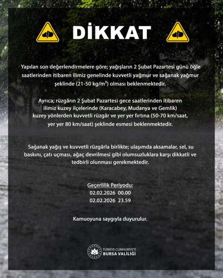 Yapılan son meteorolojik değerlendirmelere göre 2 Şubat Pazartesi günü öğle saatlerinden itibaren Bursa genelinde kuvvetli yağmur ve sağanak yağış bekleniyor. Yağış miktarının yer yer 21 ila 50 kilogram/metrekare arasında olacağı tahmin ediliyor. Bu geceden itibaren ilin kuzey ilçeleri olan Karacabey, Mudanya ve Gemlik'te rüzgârın kuzey yönlerden kuvvetli rüzgâr ve yer yer fırtına şeklinde esmesi öngörülüyor. Rüzgâr hızının 50-70 km/saat, yer yer ise 80 km/saate kadar çıkabileceği bildirildi.