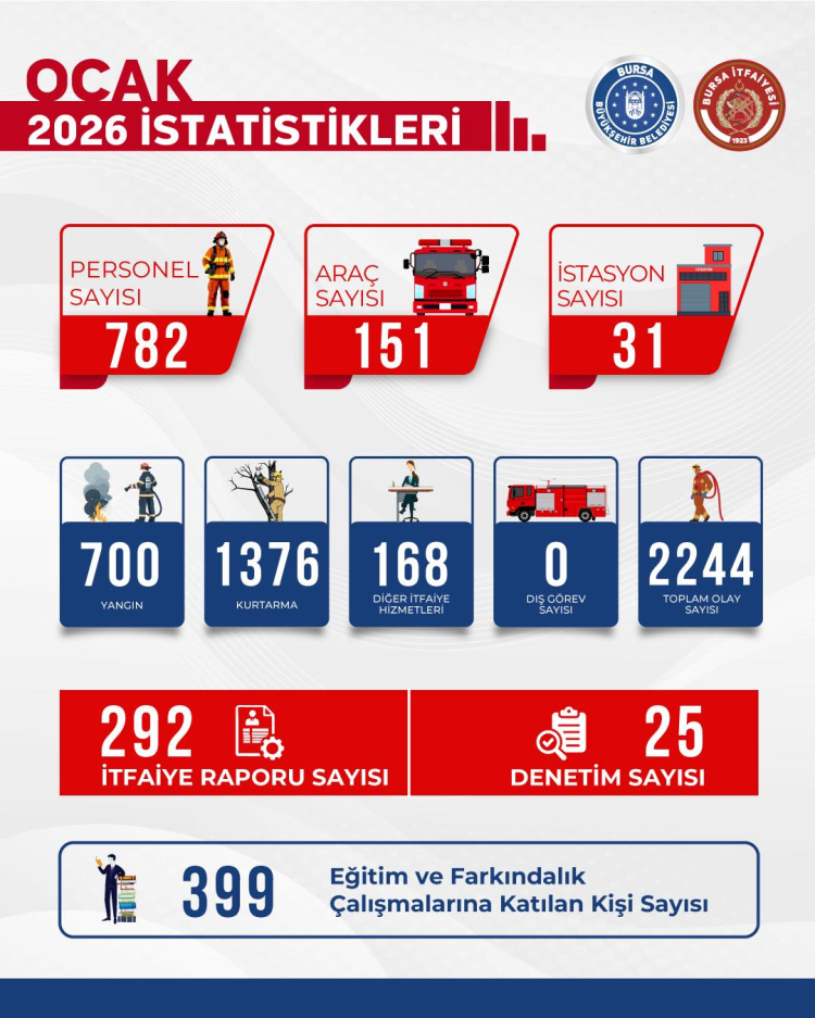 Bursa Büyükşehir Belediyesi’nin ekip, ekipman, hizmet binaları ve yeni araçlarla güçlendirmeye devam ettiği itfaiye teşkilatı, Bursalıların güven içerisinde ve huzurlu bir şekilde yaşamaları için mesailerini aralıksız sürdürüyor. Bursa’da 31 istasyonda 782 personel, 151 araçla hizmet veren İtfaiye Daire Başkanlığına bağlı ekipler, Ocak ayında da birçok olaya müdahale etti.