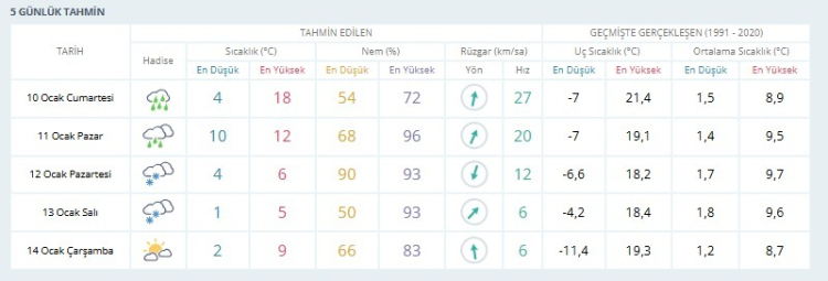 Meteoroloji Genel Müdürlüğü tarafından yayınlanan 5 günlük hava tahmini raporu şöyle: