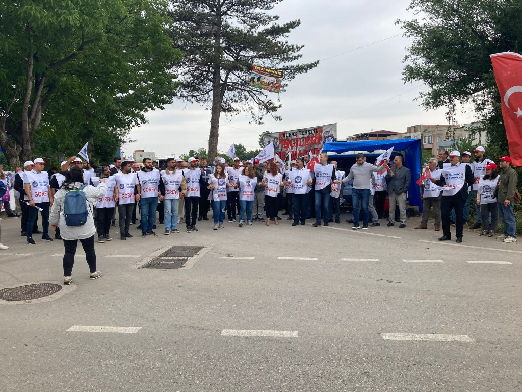 Fabrika önünde konuşan Öz İplik İş Sendikası Genel Başkanı Rafi Ay, “Selam olsun baskılara karşı yılmayan işçilerimize. Burada Durak Tekstil işvereninin, hukuk tanımaz tavrını protesto ediyoruz. İşçilerin sendikamıza üye olmasından haberdar olan işveren ve işveren vekilleri tarafından işçilere baskı yapıldı. İşçilerin anayasal, sendikal hak ve özgürlükleri engellendi. Ardından 6 işçi arkadaşımız işten çıkarıldı. Hem de ahlak ve iyi niyet kurallarına uymayan haller sebebiyle işten çıkarıldı. Biz bu akıl dışı, vicdan dışı baskıları durduracağız. İşçinin hakkını alacağız. Çalışma hayatının reel dinamikleri ve yasalar dışında araya koymaya çalıştığınız yollarla, hak mücadelesinin önüne geçemeyeceksiniz” dedi.