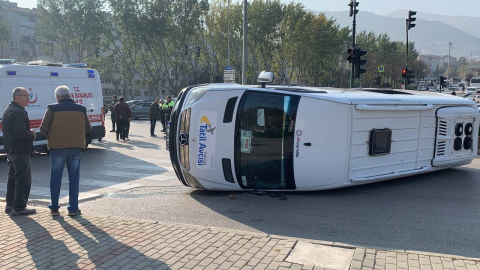 Bursa’da otomobilin çarptığı minibüs devrildi. Minibüste kimsenin bulunmaması muhtemel bir faciayı önledi.