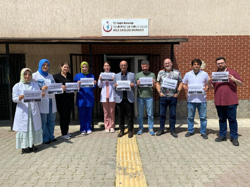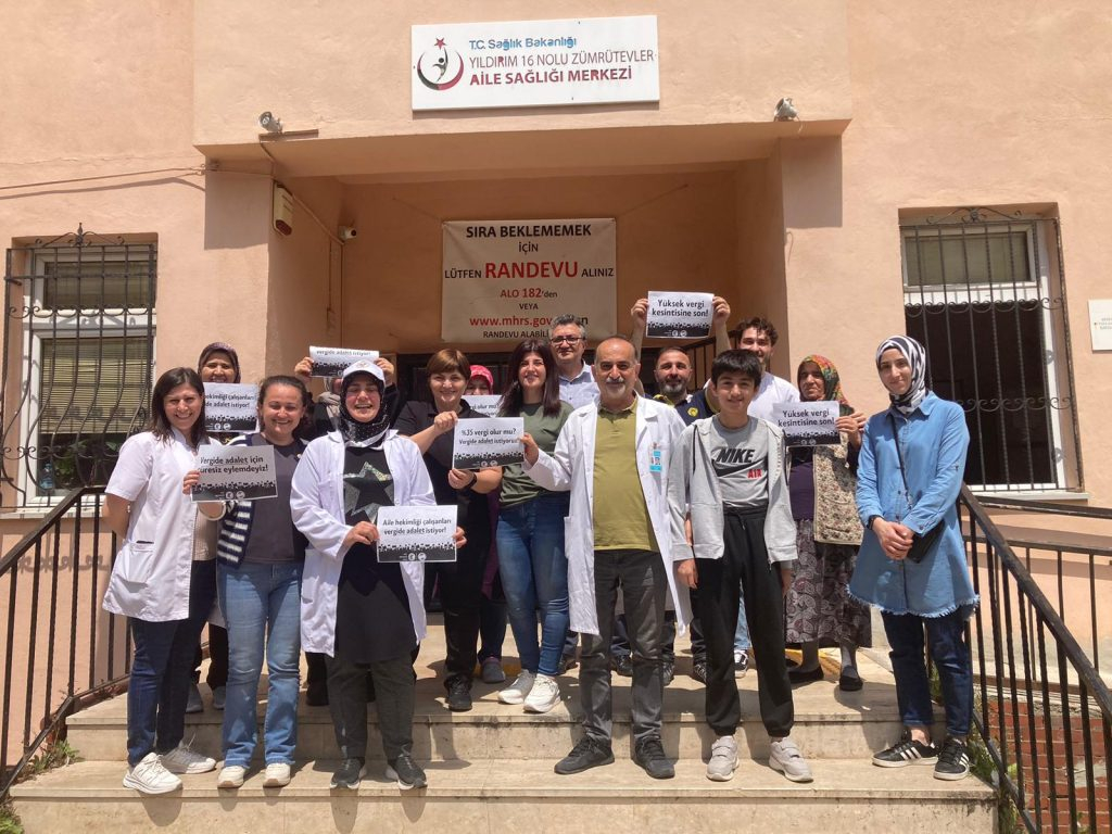 Türk Tabipleri Birliği Aile Hekimliği Kolu ile Sağlık ve Sosyal Hizmet Emekçileri Sendikası (SES) üyeleri ‘Vergide Adalet’ talebiyle Panayır ASM, Ulus ASM, Esenevler ASM, Zümrütevler ASM ve Bağlarbaşı ASM önünden eylem yaptı.