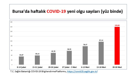 Bursa Tabip Odası Başkanı Doç. Dr. Alpaslan Türkkan, "Bursa’da (8-14 Şubat) haftasında yüz binde 34,87 olan haftalık COVID-19 yeni vaka sayısı yüzde 358 artışla (20-26 Mart) haftasında yüz binde 159,68’e yükseldiğini" söyledi.