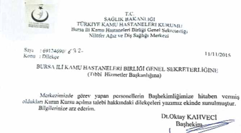 Aşkın, “Kuran öğretilecek çok sayıda alternatif dini alan varken, mekan itibariyle böyle bir şeye uygun olmayan hastanede Kuran kursu açılmasını uygun bulmuyoruz” dedi. Genel Sekterelik, 19 Kasım 2015 tarih ve 74986209 sayılı kararıyla Kuran kursu açılmasının uygun bulunmadığına ilişkin cevabi yazıyı Nilüfer Ağız ve Diş Sağlığı Merkezi Başhekimliği’ne gönderdi.