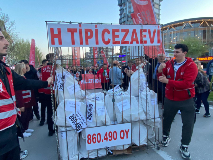 Mustafa Bozbey'in belediye başkanlığında aldığı 860 bin 490 oyu temsilen 'H Tipi cezaevi' maketini taşıyan CHP'liler dikkat çekti.