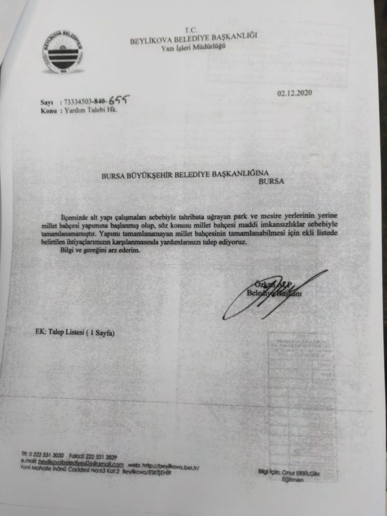 Daha henüz Rize Meydanı için yapılan ve kamuoyunun büyük tepkisini çeken 427 bin TL’lik desteğin mürekkebi kurumadan, şimdi de Eskişehir’in Beylikova ilçesinde yapılmakta olan millet bahçesi için 350 bin TL’yi aşan yardım kararı alındığını söyleyen Türkoğlu, "17-12-2020 tarihli Bursa Büyükşehir Belediye Meclisi kararına göre söz konusu destek için Başkan Alinur Aktaş’a yetki verildiğini" söyledi.
