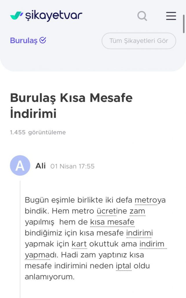 Kısa mesafe para iade uygulamasının kaldırılması yurttaşlar taradından tepkilere sebep oldu. Bazı yurttaşlar rahatsızlıklarını online şikayet siteleri üzerinden duyurmaya çalıştı. Kısa mesafe ücret iadesi uygulamasının kaldırıldığını teyit eden Burulaş personeli bu uygulamanın neden ve ne zaman kaldırıldığına dair ise bilgi vermedi.
