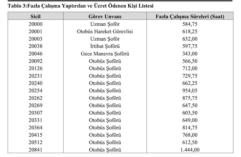 Sayıştay’ın raporunda listelediği personeller arasında, çalışma saatleri dışında 1.444 saat fazla çalışan otobüs şoförünün olduğu dikkat çekerken, onu en yakın takip eden şoförün de 954 saat fazla çalışma kapsamında çalıştırıldığı görüldü. Rapora çalışma süreleri yansıyan 18 personel arasında yer alan gece manevra şoförünün 343 saat, iki uzman şoförlerden birinin 584,75 bir diğerinin ise 632 saat fazladan çalıştırıldığı belirlendi.