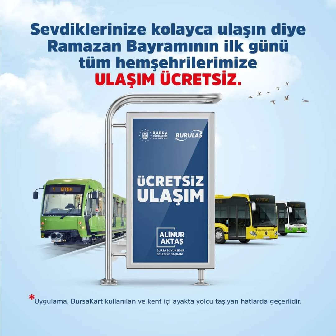 Bursa Büyükşehir Belediyesi tarafından yapılan duyuruda ise Ramazan Bayramı'nın ilk gününde (21 Nisan) toplu taşımanın ücretsiz olacağı belirtildi.