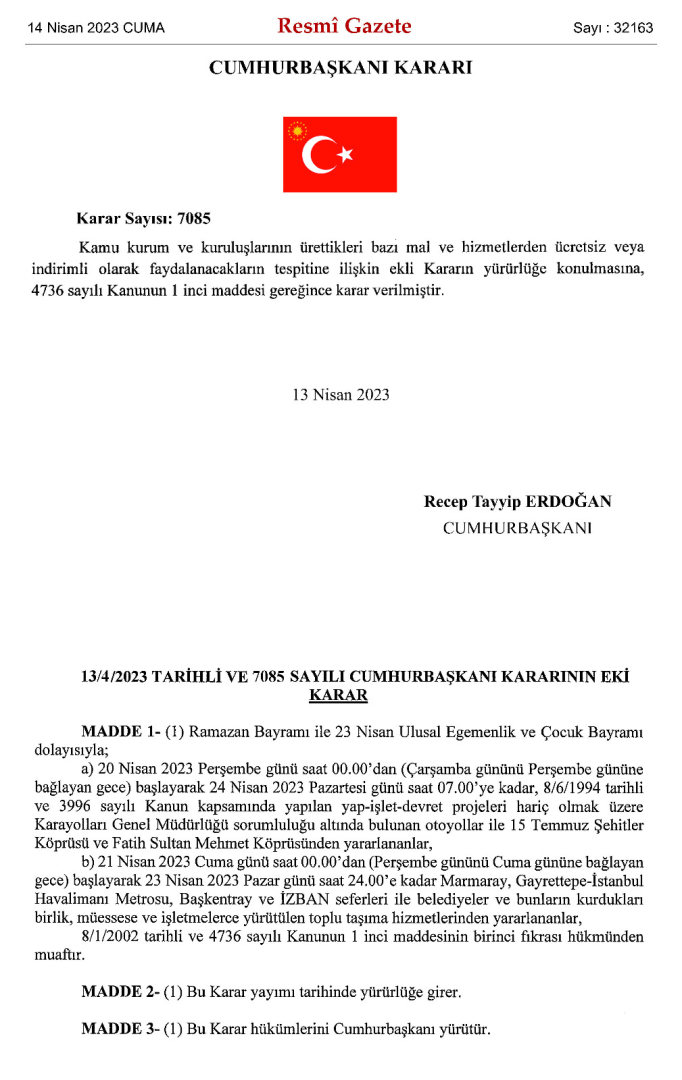Ramazan Bayramı'nda kent içi toplu taşımanın yanı sıra köprü ve otoyollar ile İzmir, Ankara ve İstanbul'da toplu taşımanın ücretsiz olmasını içeren karar Resmi Gazete'de yayınlandı.