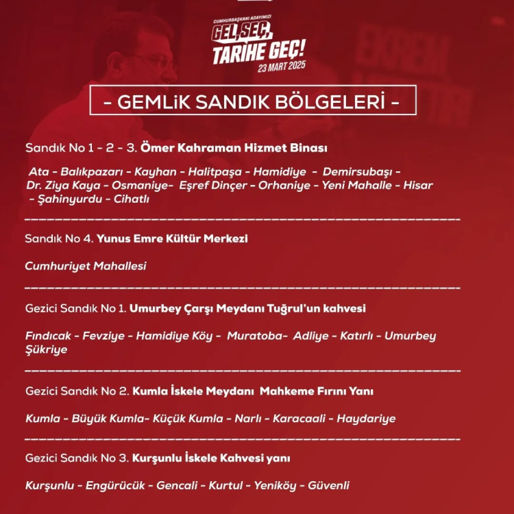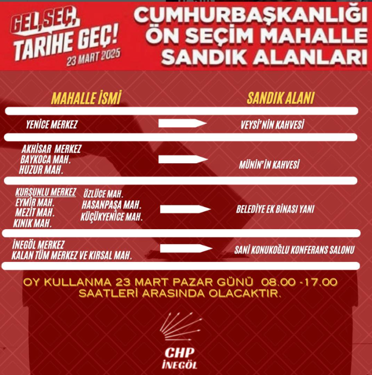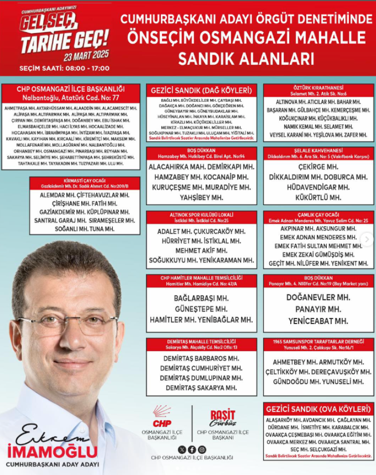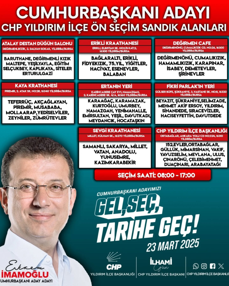 Cumhuriyet Halk Partisi'nin (CHP) Cumhurbaşkanı aday adayını belirlemek için 23 Mart'ta düzenleyeceği ön seçim sandıklarının Bursa'daki noktaları belli oldu.