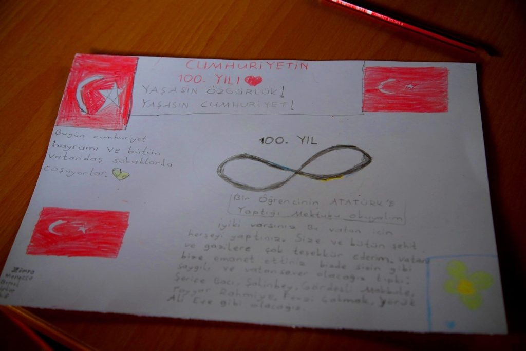 Atölyede Türkiye Cumhuriyeti’nin Kurucusu Mustafa Kemal Atatürk’e mektup da yazan öğrenciler, 100. yılda duygu ve düşüncelerini aktardılar. Kaleme aldıkları mektupta Cumhuriyet’in ve özgürlüğün önemini belirten çocuklar, minnetlerini dile getirdiler. Kendi üslupları ile bugün yaşadıklarını anlatan öğrenciler, saygı ve sevgilerini ifade ettiler. Daha sonra gruplara ayrılan çocuklar, Cumhuriyet’in 100. yılına özel gazete hazırladılar.