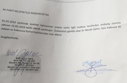 AKP'li Nilüfer Belediye Başkan Adayı Necati Şahin'in dağıttığı promosyon kahvelerin üzerinde üretim tarihinin 15 Mart 2019 olarak yazılması üzerine yaptığımız haber, Türkiye'nin gündemine oturdu. Bursa Muhalif'e ulaşan Efe Gold kahve firması sahibi Yücel Demirel, Necati Şahin'in standart üretim yaptıkları miktarın altında sipariş verdiği için ambalajı her zaman bastırdıkları matbaada değil de Bursa'da bastırdıklarını ve matbaanın da sehven 15 Mart yazdığını belirtti. Türk kahvesi firmalarının genellikle üretim tarihi yazmadıklarını, yalnızca ay ve yıl yazdıklarını dile getiren Demirel, matbaa tarafından yapılan hatayı farketmediklerini ve bu konuda üzgün olduklarını ifade etti.