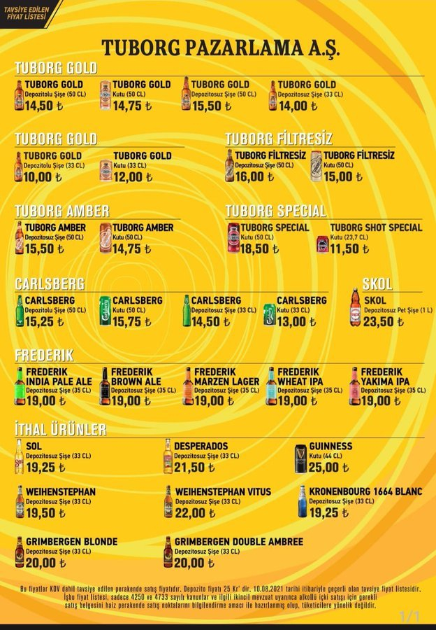 Yayınlanan tavsiye satış fiyatı listesine göre, Tuborg Gold 50 CL Şişe (depozitolu) 14,50 TL olurken, Carslberg 50 CL Şişe 15,25 TL olarak fiyatlandırıldı. 35 CL Frederik Craft serisinin ise satış fiyatı 19 TL oldu.