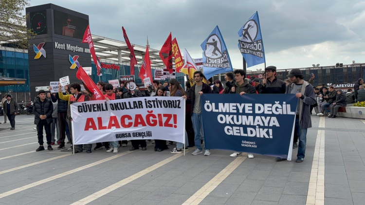 Bursa'da gençlik örgütlerinin çağrısıyla Kent Meydanı'nda bir araya gelen gençler, Maraş ve Urfa'daki okul saldırılarını protesto etmek için İl Milli Eğitim Müdürlüğü önüne yürüdü.