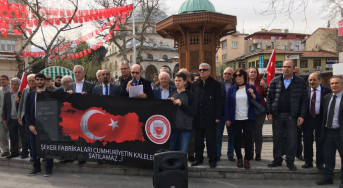 Atatürkçü Düşünce Derneği Bursa Şubesi'nin Şehreküstü Meydanı'ndaki eyleminde konuşan Şube Başkanı Nedret Yayla, AKP iktidarının özelleştirme adı altında Cumhuriyet'in ekonomik kazanımlarını elden çıkardığını belirterek, "AKP iktidarı bu kez 14 şeker fabrikasını feda ediyor. 3-18 Nisan 2018 tarihleri arasında yapılacak 3 grup ihale ile tarımsal sanayinin can damarı ile şeker pancarı üretiminin hayat damarları koparılırken, GDO'lu tatlandırıcı üreten emperyalist şirketlerin önü açılıyor." dedi.