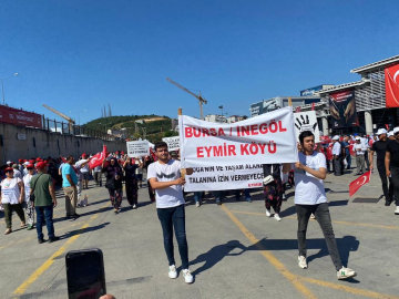 "Eymir bizimdir, bizim kalacak" sloganlarıyla miting alanında "Ölüler altın takmaz", "Siyanüre hayır, toprağına, köyüne sahip" pankartlarıyla yer alan Eymir halkı, maden çalışmaları ile köylerinin yok edilmesine karşı mücadelelerini Kocaeli'ne taşıdı.