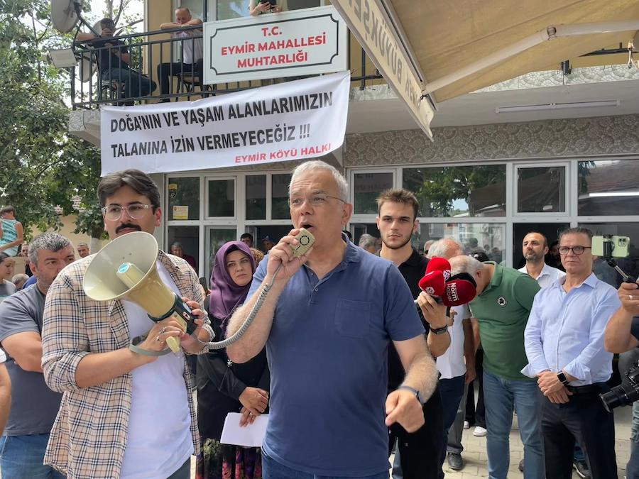 Eymir halkını yalnız bırakmayan CHP Bursa Milletvekilleri Hasan Öztürk, Orhan Sarıbal ve Kayıhan Pala da alandan köy halkına seslendi.