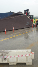 Gemlik'te bulunan Serbest Bölge tır bekleme sahasında meydana gelen kazada, yabancı plakalı bir tır prefabrik binayı yıktı. Kazada 3 kişi hafif şekilde yaralandı.