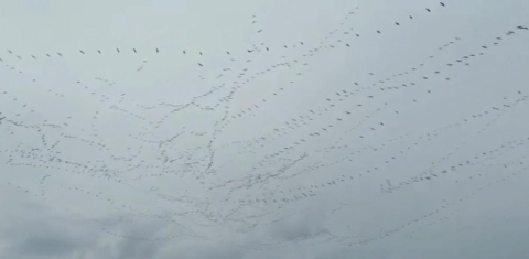 Yüz binlerce leyleğin havada dans edercesine aynı anda uçması renkli görüntüler oluşturdu.